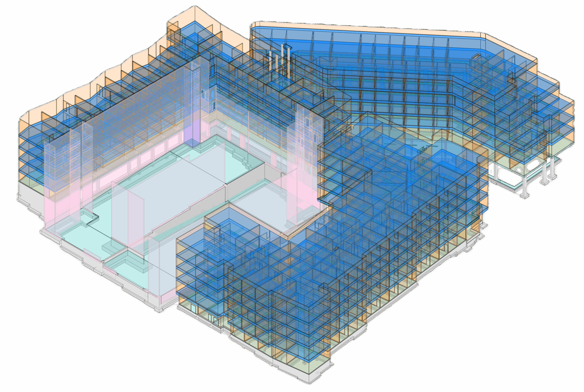 Building structure is the most critical scope at the onset of a project and one of the least flexible aspects of a project. We model the concrete structure to virtually construct the design before work begins, allowing us to uncover unknowns and coordinate the design. We then integrate the structural steel model to verify connection feasibility and ensure no scope gaps remain.